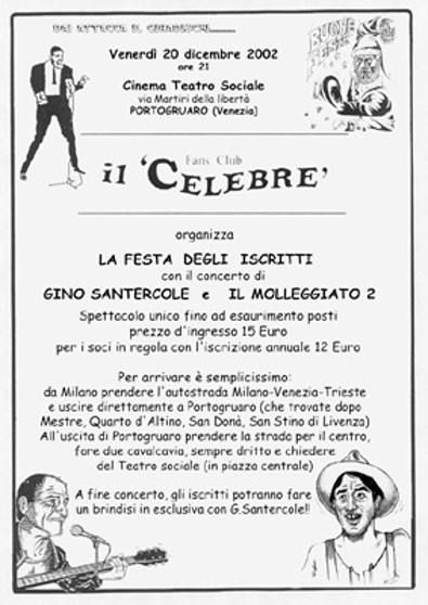 | Il Raduno del 2002 avrebbe dovuto svolgersi vicino a Venezia con Gino Santercole, ma per motivi tecnici saltò all'ultimo momento... | ...così abbiamo recuperato nel 2003, senza Gino ma... al "Delfino". | I "Celebrini", ideati per il Raduno 2006 come premi per il "1° Festival del Celebre". |